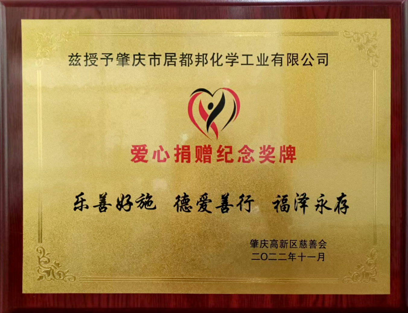 11月16日,“奉獻愛心力量,彰顯企業(yè)擔當”,肇慶市高新區(qū)愛心慈善會,為肇慶市居都邦化學(xué)工業(yè)有限公司授予《愛心捐贈紀念獎...